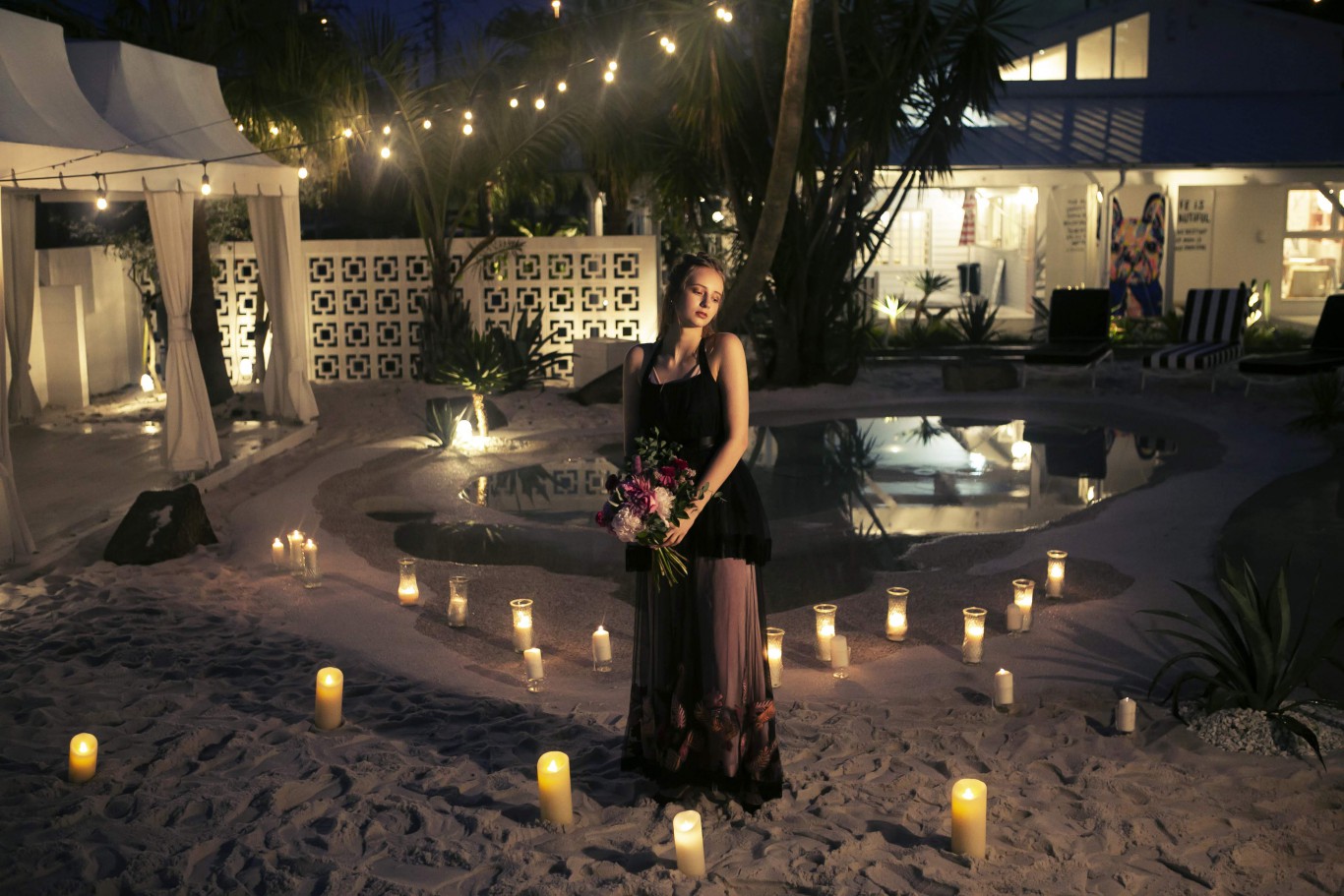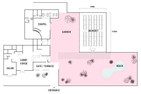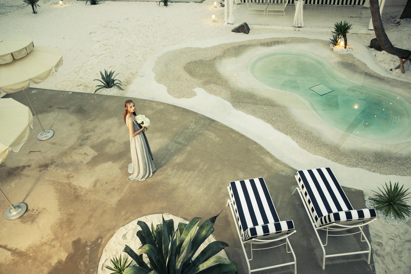青い空の下ホワイトサンドが敷き詰められたビーチとプールを取り囲んで、ドリンク片手にゲストと触れ合える Instagenic なマルチスペース